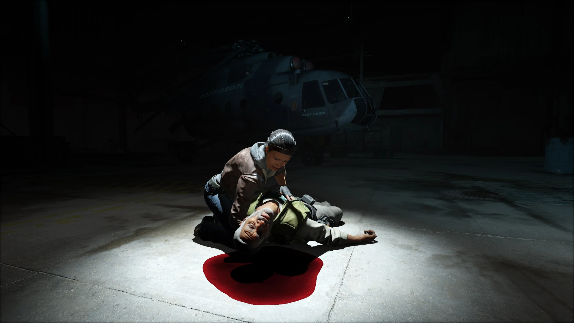 Alyx desconsolada al ver a su padre muerto tras el ataque de los Consejeros Combine en el hangar.