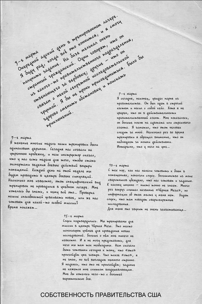 - «12 марта. Полно слухов витает с начала нашей боевой тренировки. Большинство моих сверстников уверены, что впереди нас ждёт миссия. Какая именно — не знает никто. Я много раз слышал название «комплекс «Чёрная Меза», но никакой конкретной информации об этом месте. По слухам, там проводятся какие-то секретные исследования. Как по мне, звучит не очень захватывающе...»