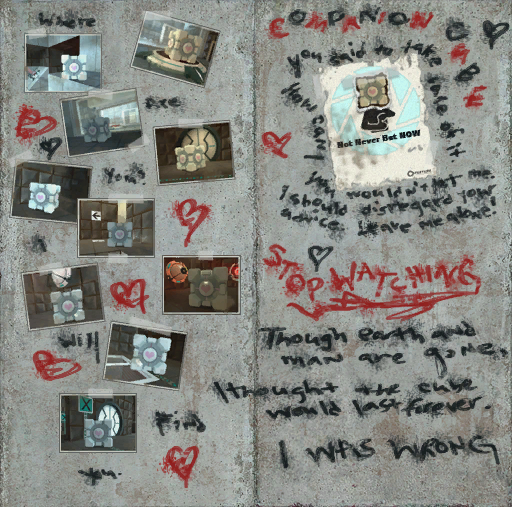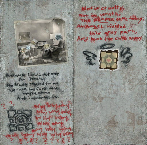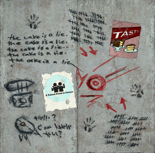 Среди двух плакатов Aperture Science Раттманн написал пять раз Торт — ложь, нарисовал падающий на турель Грузовой утяжелённый куб. |