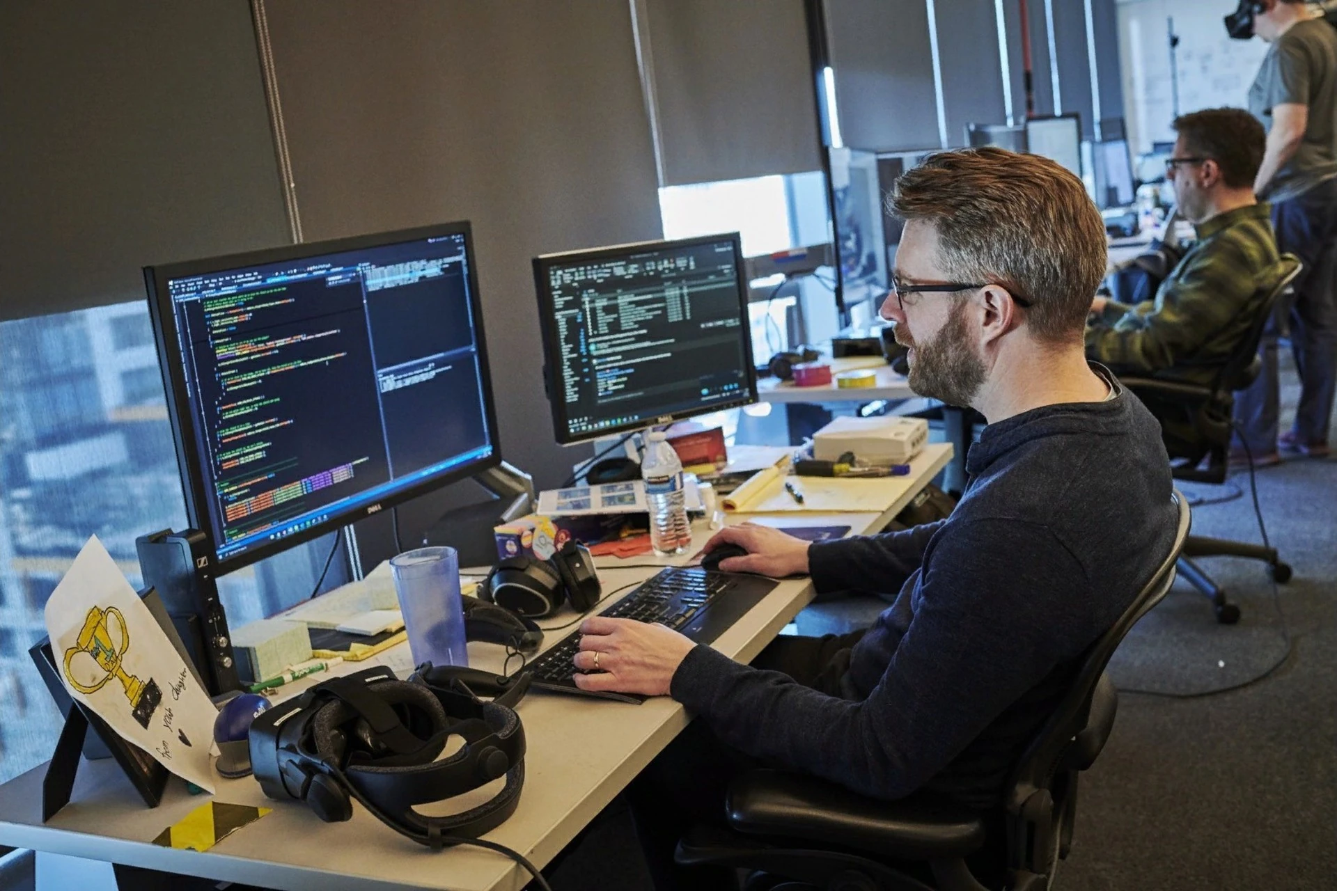 Робин Уокер за своим рабочим местом во время разработки Half-Life: Alyx.