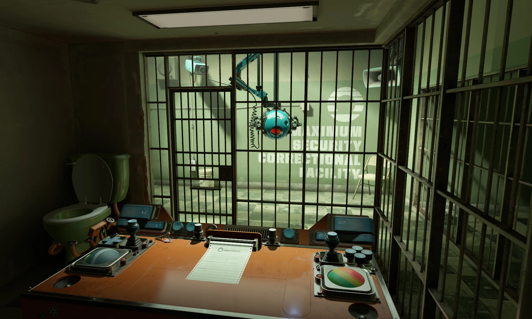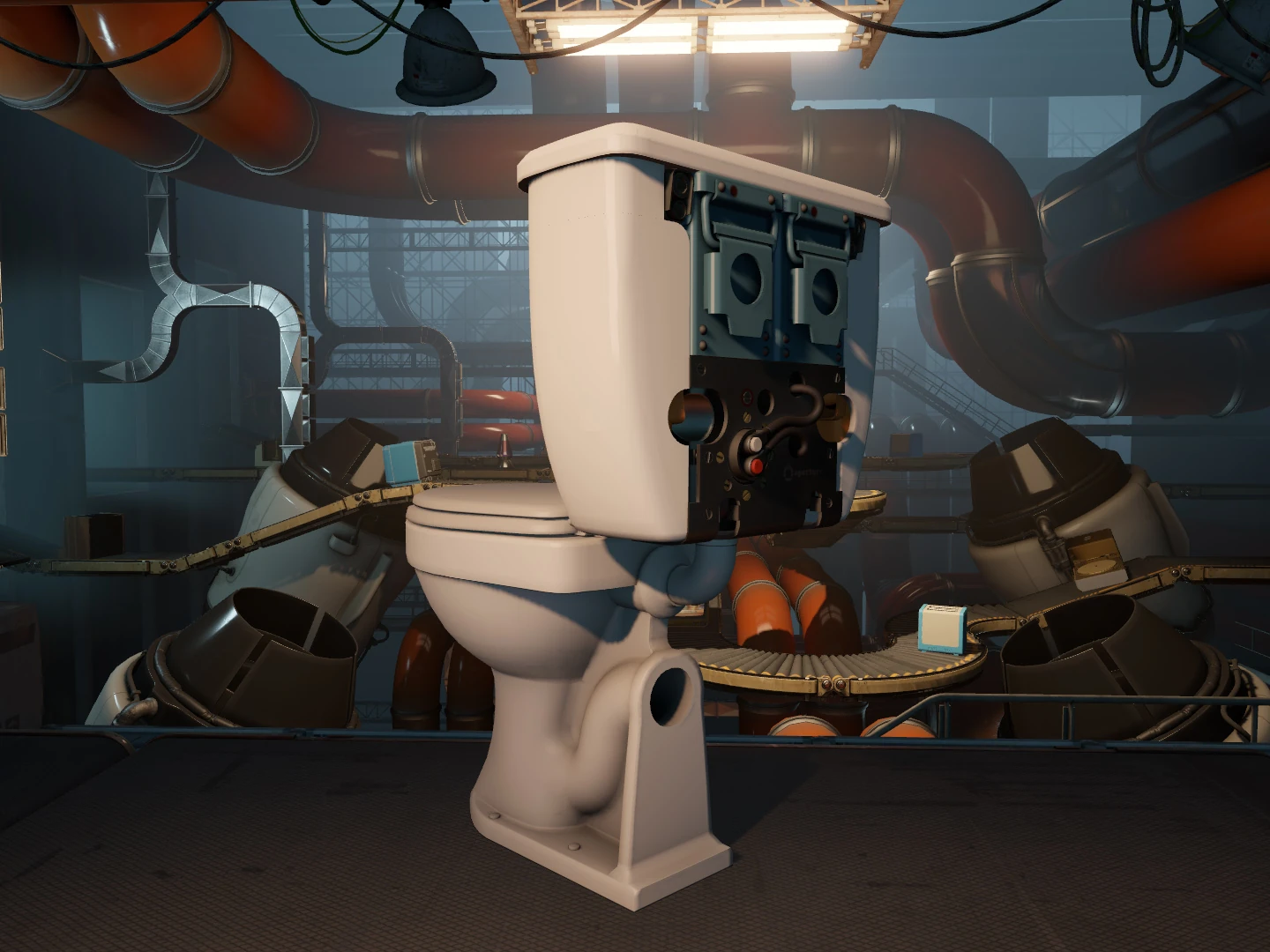Протагонист начинает свою работу у конвейера в отделе тестирования и калибровки Aperture Laboratories, испытывая эффективность унитазов и проверяя продукцию на дефекты. Игроку нужно заполнять бачок водой, оказывать давление на седушку, тестировать работоспособность биде и наконец смывать, после чего делать повторять эти действия на следующем унитазе. Из четвёртого унитаза идёт дым, Грэди предлагает игроку проигнорировать это и продолжать работу как обычно. В ходе проверки выясняется, что биде не работает. Когда Грэди приближается к дымящемуся унитазу, чтобы рассмотреть его внутреннюю часть, биде взрывается, и поток воды сталкивает модуль с манипулятора в унитаз. Пытаясь вытащить его, игрок вновь активирует неисправное биде и запускает Грэди высоко в воздух, попутно ломая трубу, предназначенную для транспортировки боеприпасов. Патроны из трубы сыпятся в унитаз, а оттуда будто бы из пулемёта стреляют в потолок. Этот любопытный феномен вызывает у Грэди интерес.