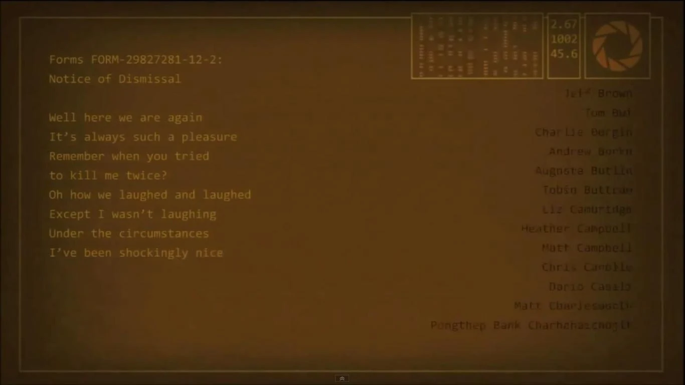 | Фанатские песни | Ballad of Black Mesa · Bird is a lie · Defective · Detach The Wheatley Core · Dumb Ways to Die · Gordon Freeman Saved My Life · Hello · Making Science · Santa Cores Are Coming Tonight · Taste the Cake · That Long Train Ride · The Night Before Christmas · The Pit Song · The Sound Of Science · The Wheatley Song · This Is Aperture · Wheatley Romance · Wheatley The Moron · Why, Wheatley, Why? | |